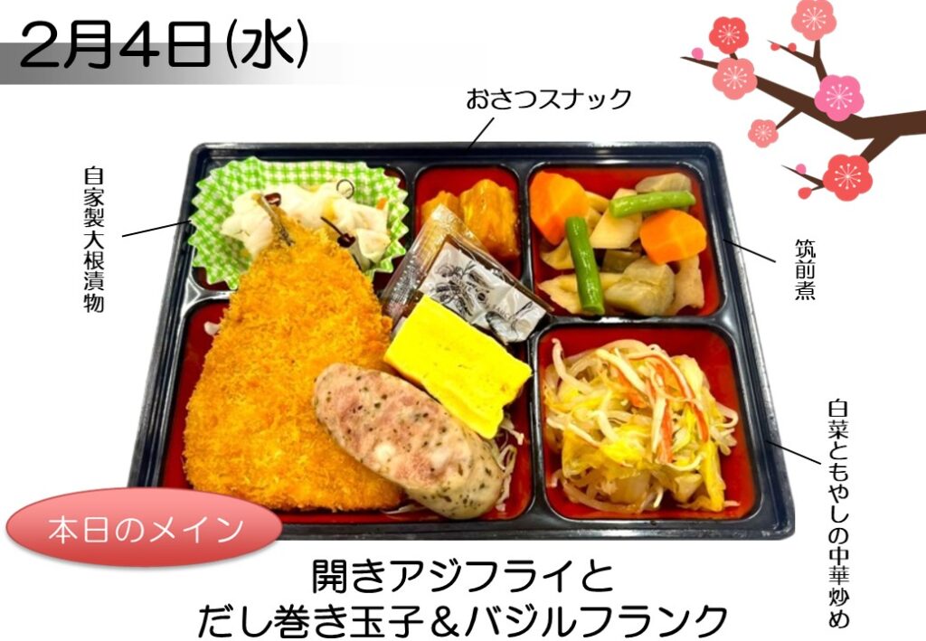 (自家製大根漬物・白菜ともやしの中華炒め・筑前煮・おさつスナック)
