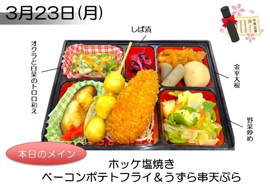 ホッケ塩焼き ベーコンポテトフライ&うずら串天ぷら